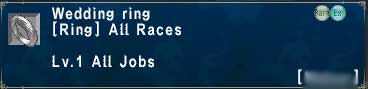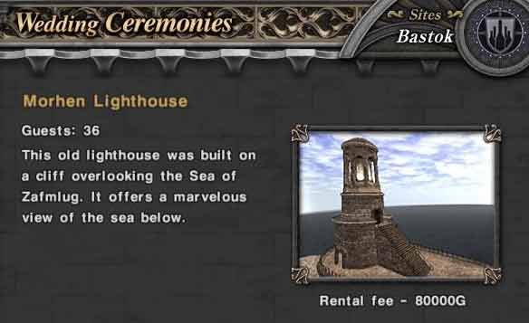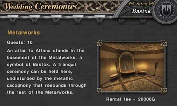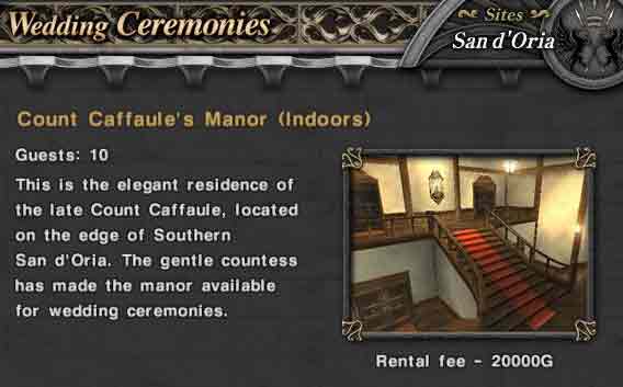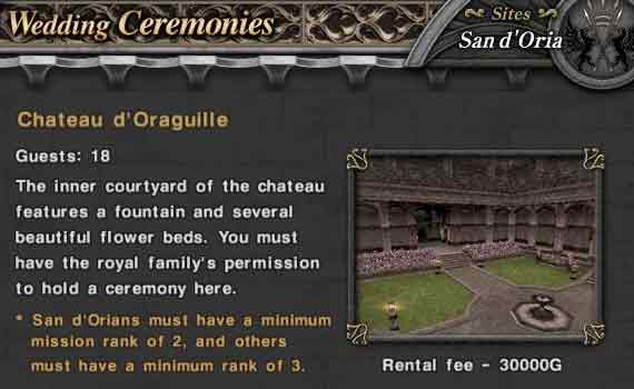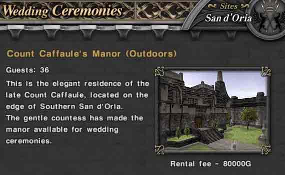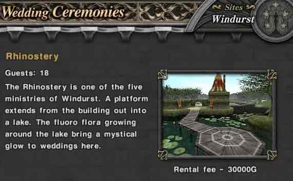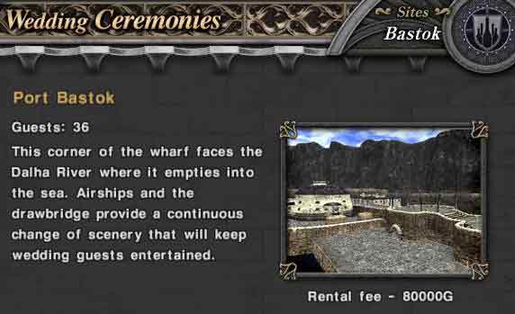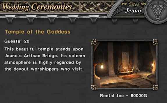 All information and pictures taken from the Wedding Ceremonies section of the FINAL FANTASY XI ONLINE Compendium, available through PlayOnline, and is the property of Square Enix Co., Ltd. Updated 4 June 2004. The Vana'diel Lobby is not responsible for incorrect or inaccurate information.
