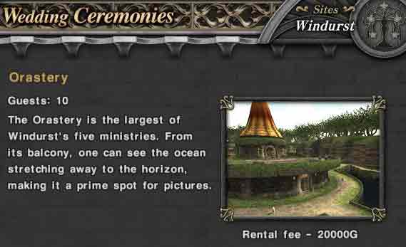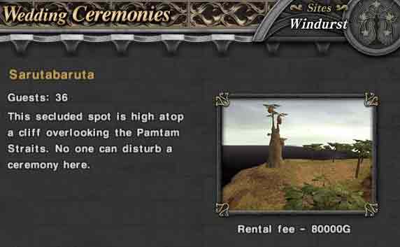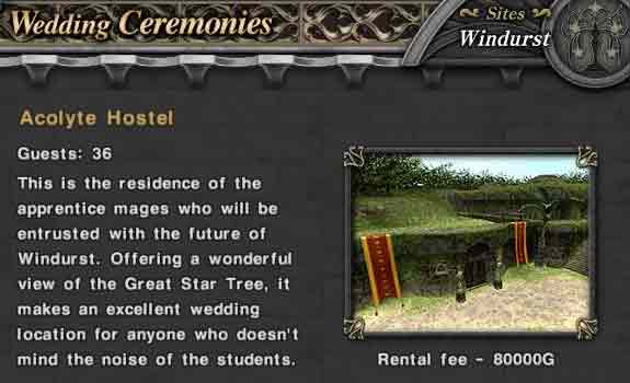 • Windurstian weddings are based on a traditional Tarutaru ceremony created by the first Star Sibyl. A Sibyl Celebrant presides over the ceremony in the Star Sibyl's place. This is an excellent choice for those who want a cheerful ceremony. The bride and groom must each prepare an offering of food beforehand.